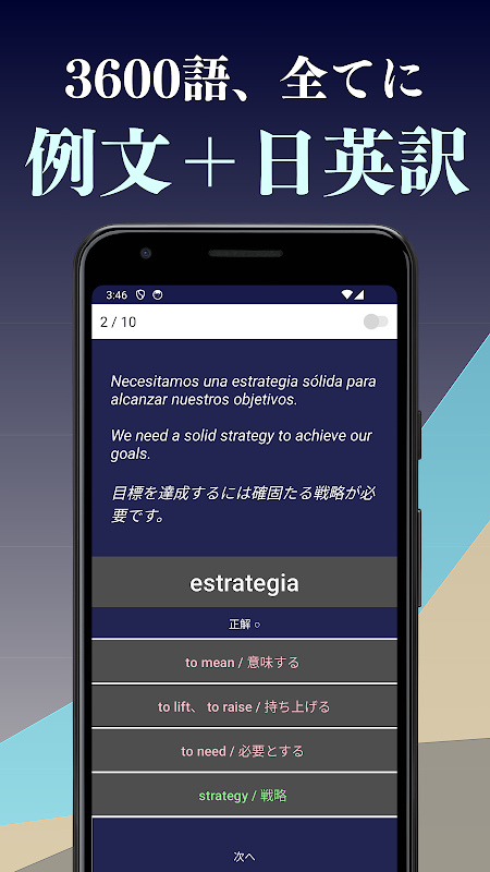 Spanish word learning app with 3600 CEFR A1-B2 level words.