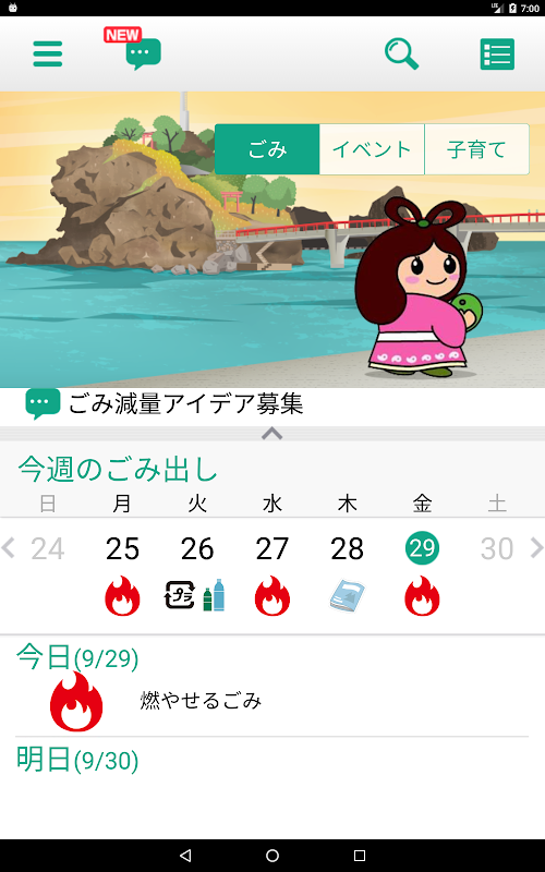 今日と明日、週ごと、月ごとの3パターンによるごみ収集日程を一つの画面ですぐに確認することができます。