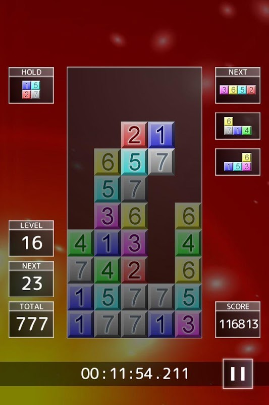いわゆる「落ちゲー」です。1~7までの数字が落ちてきて、タテかヨコが合計「7」になると消えます。ただし、7はスリーセブンの名前の通り3つ並べないと消えません。