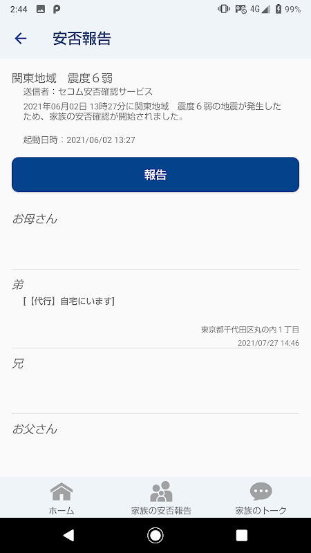 You can check the safety report contents and family talk contents in this application only between the family members registered in advance.