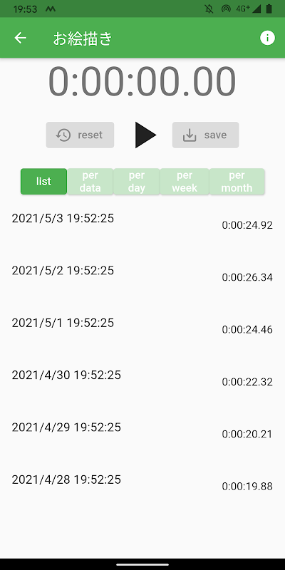 〇タイムを記録してその結果を、データ毎、日毎、週毎、月毎のグラフとして確認することができます