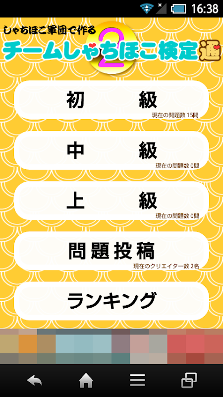 各レベル、投稿された全問題から15問がランダムで出題され、80%以上が合格です。