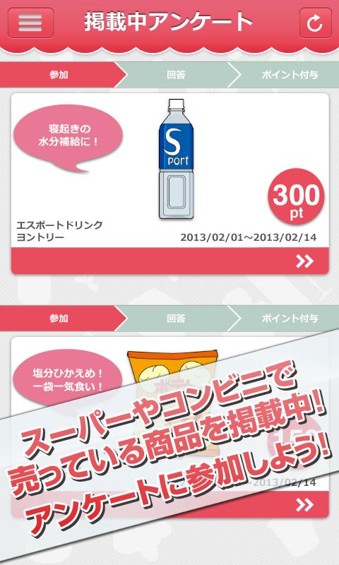 スーパーやコンビニなどで商品を購入してアンケートに答えると半額以上のポイントがもらえる「テンタメ」アプリです。毎日のお買い物を『お得に』楽しもう♪