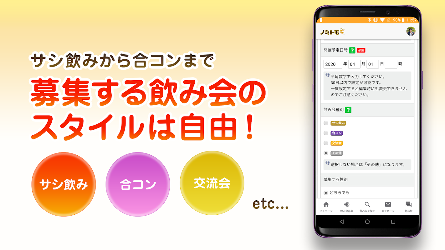 Nomitomo connects people who like drinking parties, from drinking friends to finding lovers