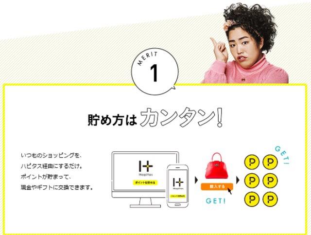 普段の生活にハピタスを+するだけで、お得でハッピーに!・業界最高水準の還元率!・ネットショッピングをする人におすすめ!・1ポイント=1円でわかりやすい!