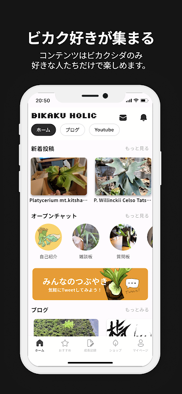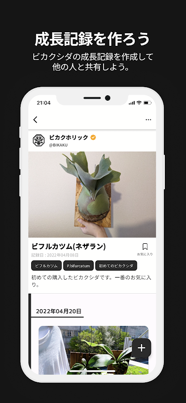 [Bikakuholic] is an app where you can create a growth record of Bikaku fern and connect with people who like Bikaku fern through open chat.