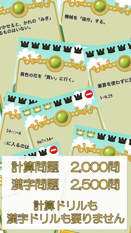 何度も反復して復習が必要な「計算」と「漢字」に特化したアプリです。もちろん、ビノバらしい楽しさがあるので、毎日繰り返し勉強しても飽きにくいです。計算と漢字合わせて、約4,500問を収録。他の学習アプリとは圧倒的にボリュームが違います。