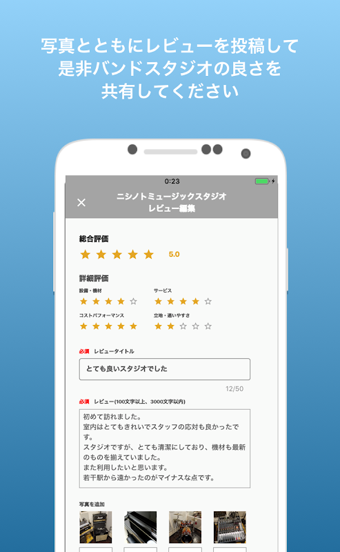 5. あなたのバンドスタジオの利用体験を気軽にシェア出来ます。