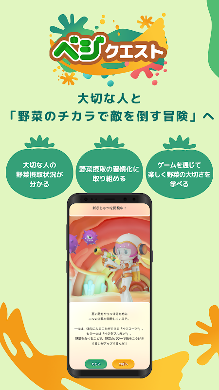 Veggie Quest is an app that aims to help you enjoy the habit of eating vegetables with your loved ones in an ``adventure to defeat enemies with the power of vegetables''!