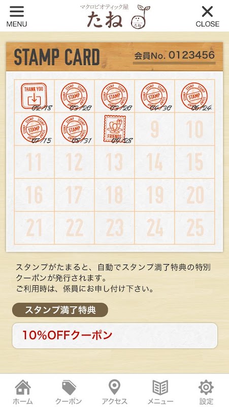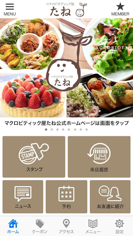 このほか、スタンプ機能(満了でお得なクーポン発行)、お誕生日にクーポンが配信されるなどお得なサービスもあります。ぜひマクロビオティック屋たねの公式アプリをあなたの手の中に!