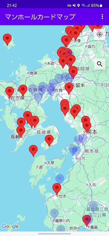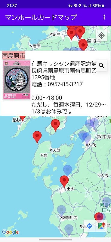 Locations where you can obtain Manhole Cards are displayed with markers on the map.