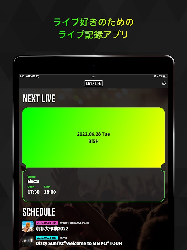 If you register a live that you plan to participate in, you can check at a glance the live that you plan to participate in (NEXT LIVE) and the live that you will participate in in the future on the home screen.