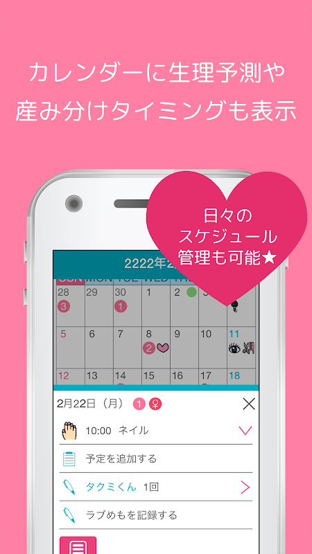 ○姉妹アプリ「リズム手帳」と連動することで生理日、排卵日を表示