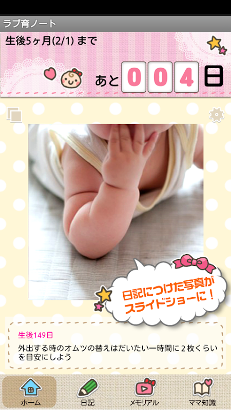 日記機能については「授乳ノート」内のできたよ!にて同様の機能を提供しております。「まごノート」と連携し祖父母と写真の共有も簡単にできます。是非ご利用ください。