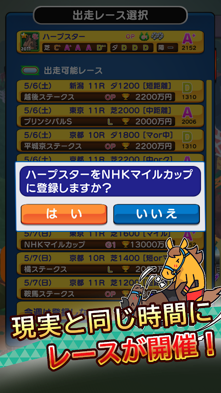 The race schedule in the game conforms to real horse racing! Have fun with real-world races!
