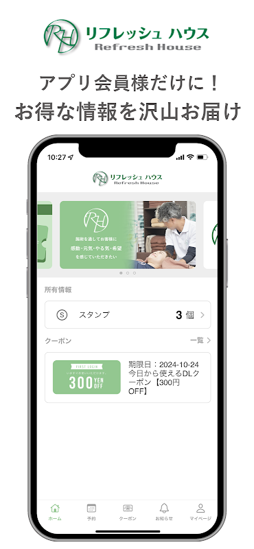 You can receive Refresh House's latest information and great deals through the app. You can also check the menu, your desired time slot, and make reservations from your smartphone at any time. By installing the app, you can use Refresh House more conveniently.