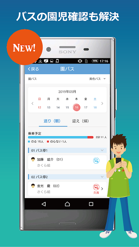 2.保護者用アプリと連携して、園からの「お知らせ」を日常も緊急時も効率よく、確実に届けます。また、保護者からの「欠席連絡」や「メッセージ」がいつでも、どこでも確認できます。