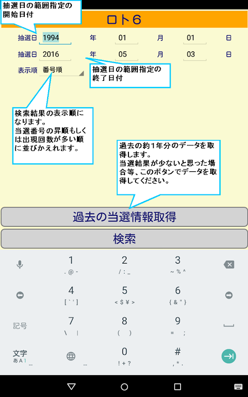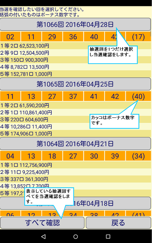 保持しているすべて過去の当選結果と抽出した数字とを確認できます。