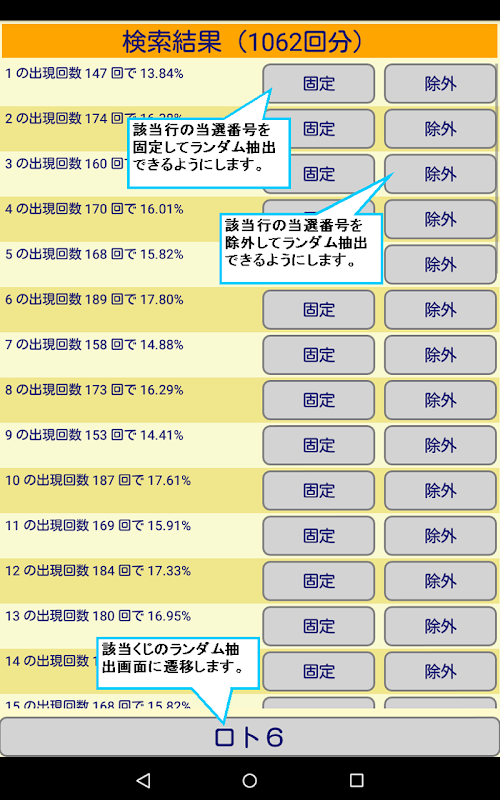 固定や除外数字を当選番号からセットできます。
