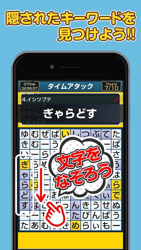 ランダムで選ばれるキーワード10個を全部見つけるまでの時間を競うモードです。