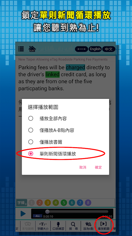 3. [Listening training] Automatic or loop reading, the range and frequency of repetition can be customized; when listening to ICRT news, in the "play range" option, provide "single news loop playback", training listening is super sensational.
