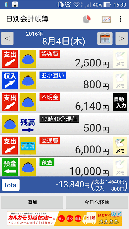 At any time, by entering the balance of the purse, input to forget that expenditure (and income) it will be automatically entered as an unknown gold is arbitrarily calculated. If, If you remember the input to forget they were spending and income, also can you be would offset the unknown gold and input from the post (For more details, please see "Using" in the app).