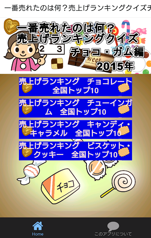 チョコレートやチューインガム、キャンディなどの身近なお菓子について売上げランキングをクイズにした無料アプリです。