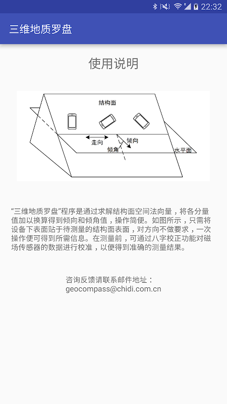 三维地质罗盘(3D Geocompass)是一款用于测量地质结构面产状的手机程序。除提供指示方位和GPS定位功能外,还可为地质人员提供结构面的倾角、倾向数据,支持拍照和文字描述功能,可实现野外数字编录的需求。测量数据可导出至本地CSV文件便于整理分析。