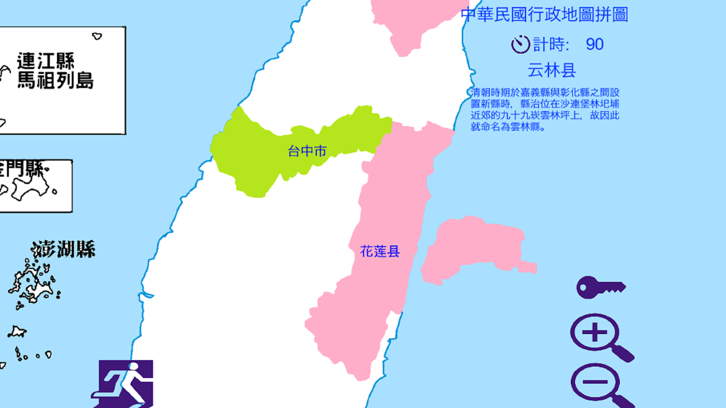 這是一款中華民國行政地圖拼圖遊戲。集趣味性,娛樂性,知識性於一體。在玩遊戲的同時,很短時間就能熟悉/記住各行政區的名稱,位置,形狀。來挑戰一下吧!