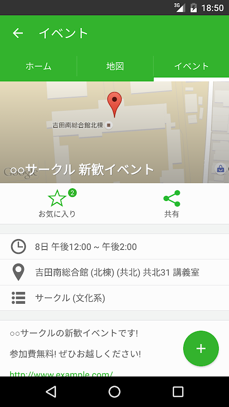 京大内の情報共有地図アプリ 多くの建物や教室の情報を得られるとともに, 簡単に投稿できるイベント機能で様々なイベント情報を簡単に共有できます.