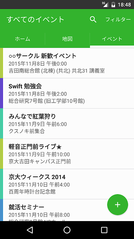 京大マップでは, 京大内のセミナーや講演会といったイベントに加えて, 様々なサークルによるイベントの情報をチェック出来ます.
