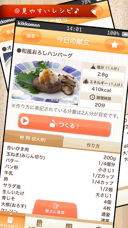 「今日の献立」を使えば、選りすぐりのキッコーマンの公式レシピから、簡単に毎日の献立を決めることができます。カロリーグラフ、1週間先の献立をあらかじめ決められる献立表、お買い物に役立つ、お買い物メモ機能もついています!