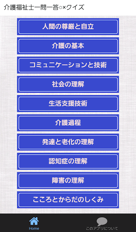 これは介護福祉士国家試験に合格するためにわずかな時間で効率良く勉強が出来るように一問一答方式で出題しているアプリです。
