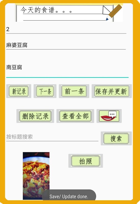 会说话的食谱书用于保存您喜欢的食谱。您可以输入食谱的标题,食谱的详细信息,例如所需的成分,执行方法和食谱图片!此外,您还可以通过点击“讲话”按钮来收听读出的食谱。