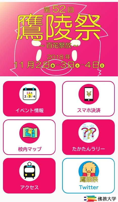 校内MAP、交通アクセス、イベント情報へのリンクもついて、鷹陵祭に必携のアプリです。