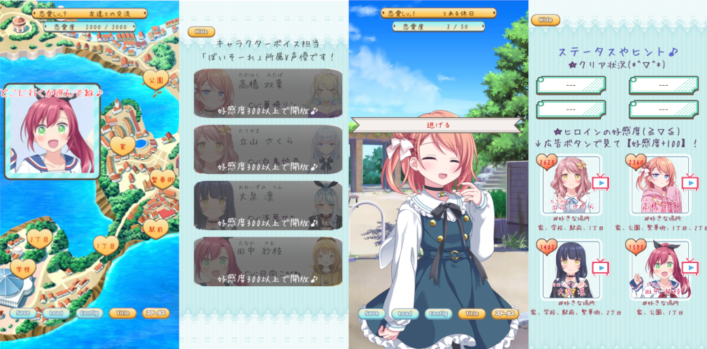 ・ You can see hint information such as the favorability of each heroine and the place where the heroine appears.