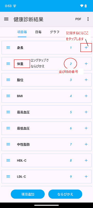 ▼To record health checkup results on the daily screen/all-period screen, follow the steps below.