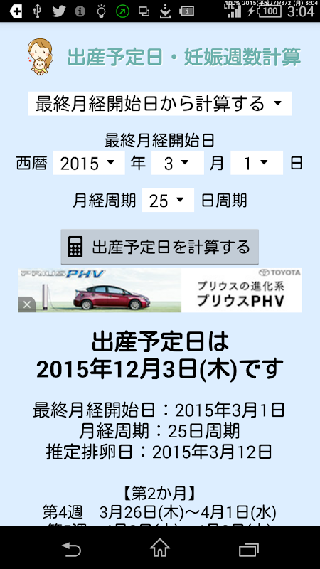 If you enter the last menstrual date or day of ovulation, it displays the expected date of birth and gestational age of schedule.