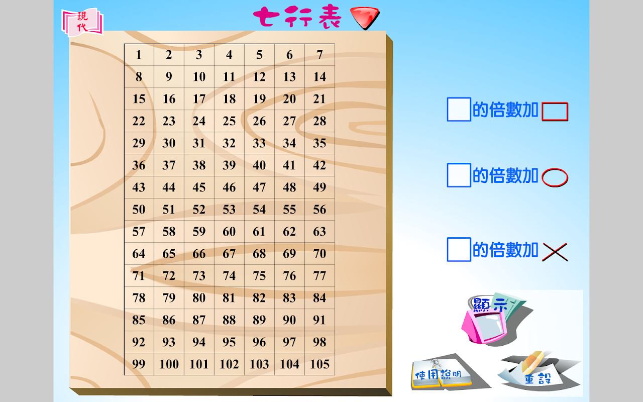 學生可在十行表內加上記號,認識倍數在十行表內分佈,程式設有顯示不同倍數的功能,讓學生能找出相應的公倍數。也可選擇六行表、七行表、八行表或九行表,進一步探究。
