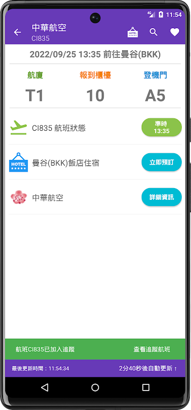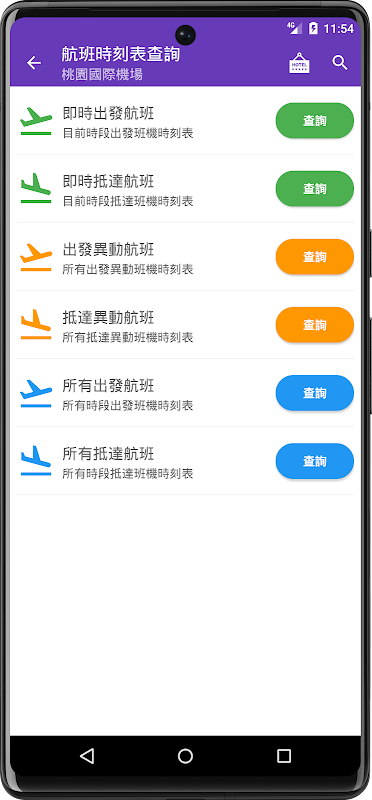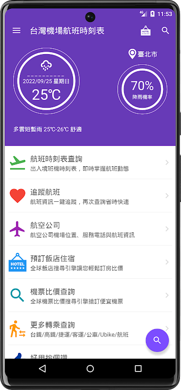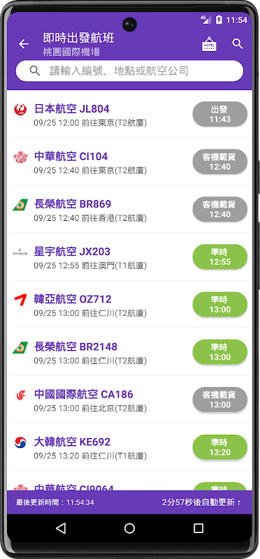 Supports real-time status tracking of flights at Taoyuan International Airport/Kaohsiung International Airport/Taipei Songshan Airport/Taichung International Airport/Penghu Magong Airport/Kinmen Airport/Tainan Airport/Taitung Airport/Mazu Airport/Hualien Airport/Mazu Beigan Airport/Mazu Nangan Airport/Chiayi Airport/Lanyu Airport/Green Island Airport/Penghu Chimei Airport/Penghu Wangan Airport and other airports in Taiwan.
