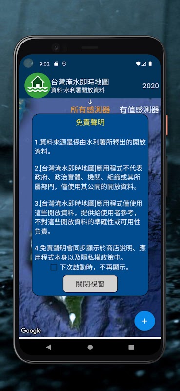 ● The "Taiwan Flooding Real-time Map" application has no relationship with the government, political entities, agencies, organizations or their affiliated departments. It only uses their publicly available open data to provide users with reference, and does not assume any responsibility for the accuracy of these open data. is responsible for the availability or availability of such information and assumes no legal liability or responsibility for any loss, damage or injury that may arise directly or indirectly from the use of these materials.