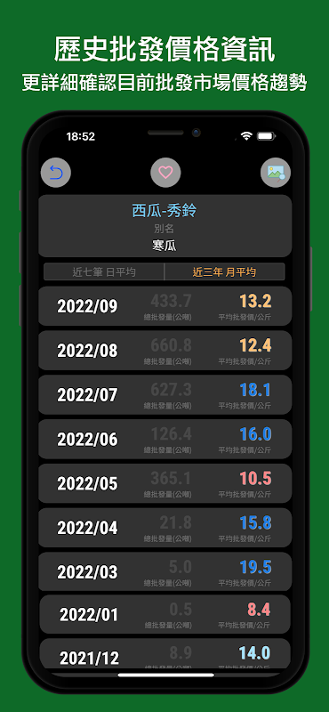 - You can check the daily average wholesale price of the last seven groups of each item, as well as the average monthly wholesale price of the past three years, to easily understand the price trend changes.