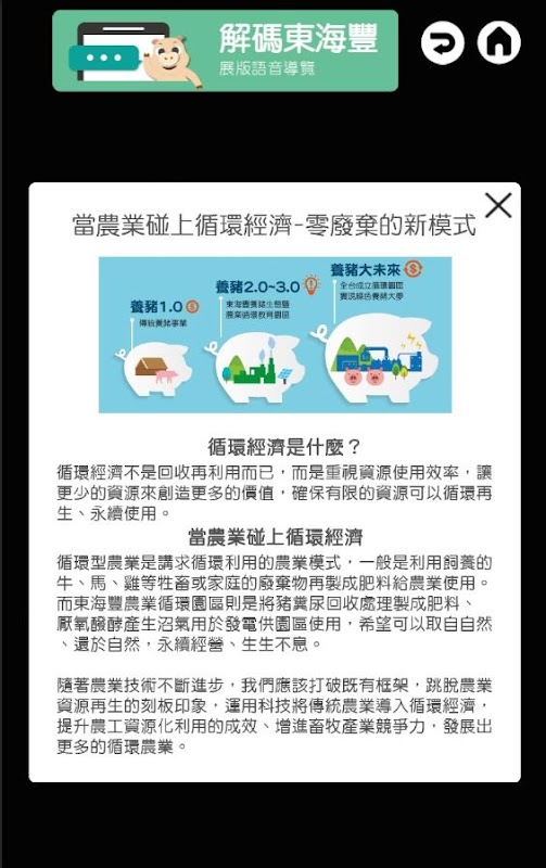 詳細說明:歡迎來到東海豐農業循環園區!下載APP後,就可以在展示中心和整個園區裡,探索東海豐永續又與眾不同的秘密!