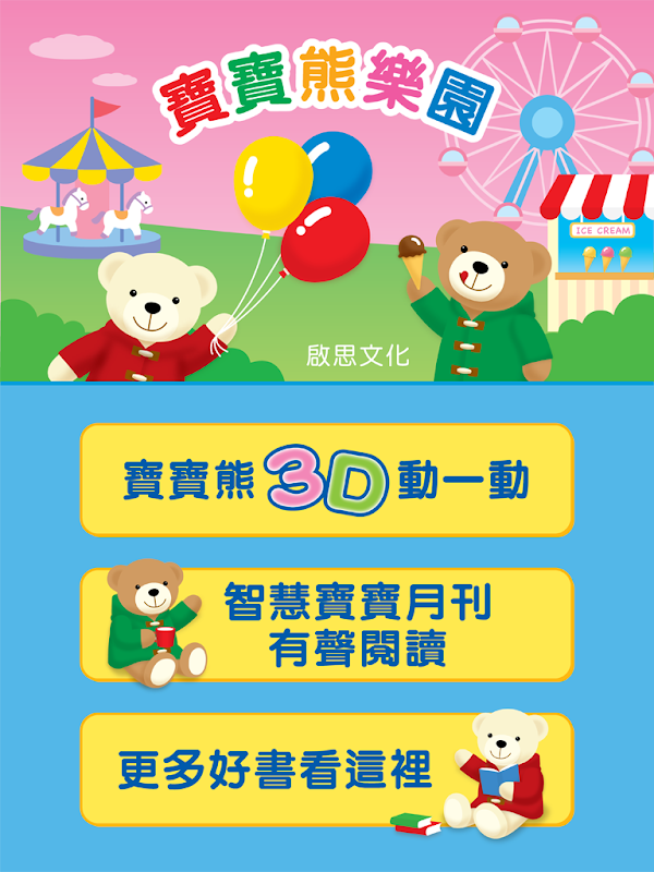 這是一個可以聽故事、玩拼圖、著色和寶寶熊玩3D互動及分享的幼兒益智多功能互動APP。