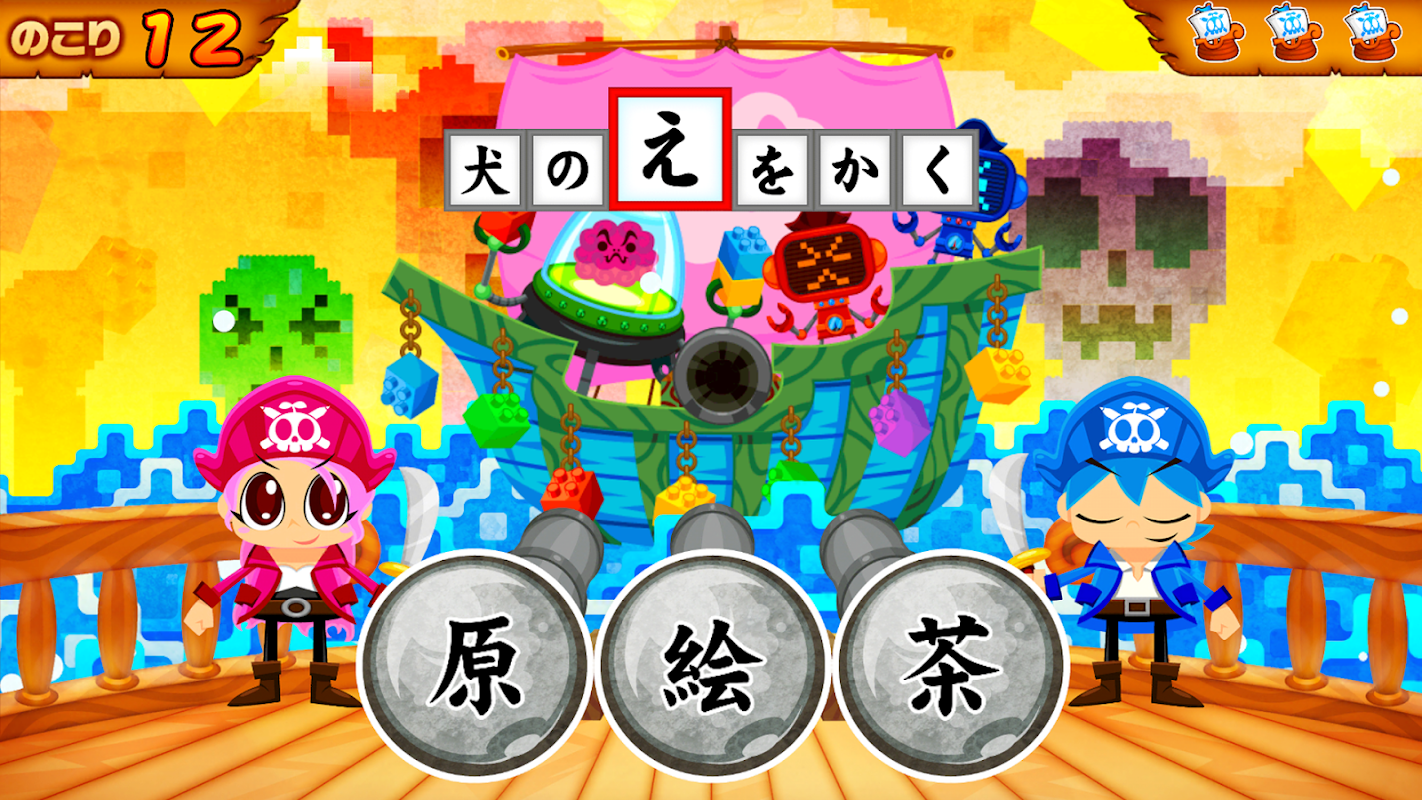 Answer the reading of the kanji written on the sail of the approaching pirate ship. If you answer correctly, you can shoot a cannon at your opponent! It's simple with three choices, so it's easy to remember and learn.