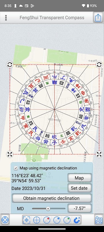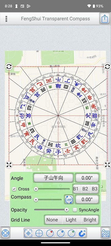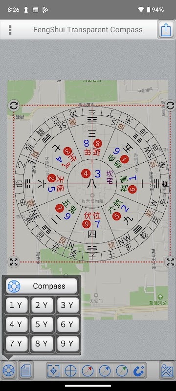 "FengShui Transparent Compass" is a tool used for measuring orientation on "maps" and "house architectural floor plans." It provides various polar scales, acting as a transparent compass overlaid on a map or image to facilitate orientation measurement and Feng Shui assessment.