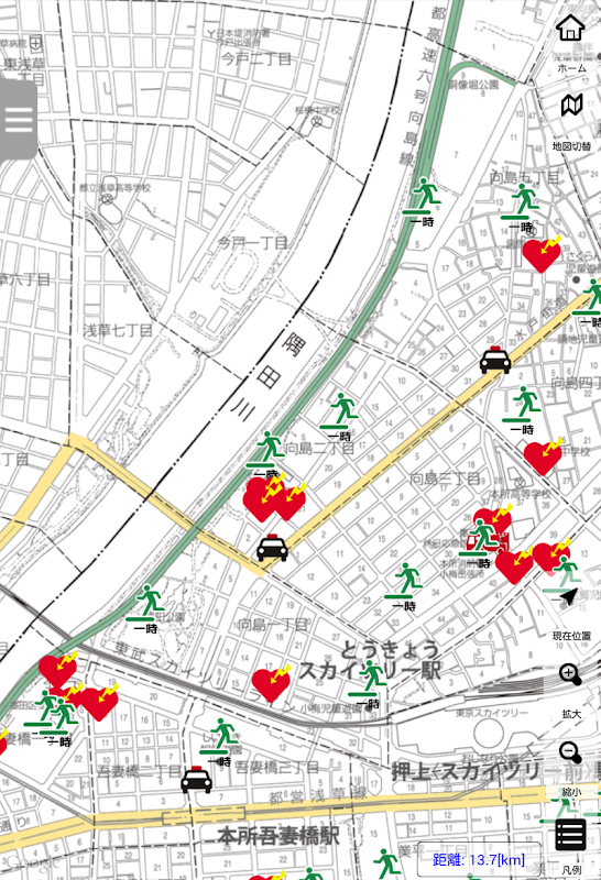"Sumida Ward Disaster Prevention Map" is an application that allows you to browse disaster prevention information in Sumida Ward, Tokyo on your smartphone. You can check the nearest evacuation shelter or evacuation site using GPS.