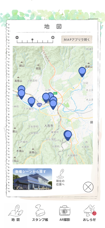 We have a variety of content that will make your walk around town more enjoyable, including a digital stamp rally, AR photography with demons, introductions to anime scenes of model locations, and weather information for the Hitoyoshi and Kuma areas.
