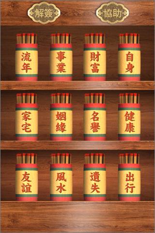 選擇一個你想預測前程的簽筒(流年, 事業, 財富, 自身, 家宅, 姻緣, 移居, 名譽, 健康, 友誼, 風水, 遺失, 自身, 天時, 出行), 誠心地用手腕前後搖動手提裝置直到抽出靈簽 , 根據古人典故解說靈簽含義。