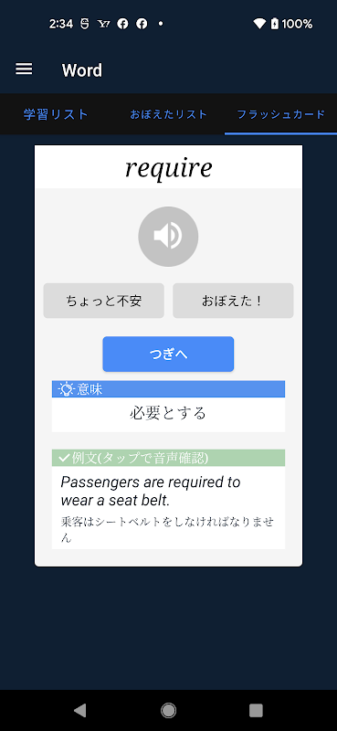 The app will automatically create a flashcard from your study list, so listen to it and see it to learn English words! When you're done, learn again and again with the RESET ALL button at the top of the list you remembered! The [Number of times you remembered everything] in your learning history will increase by one.